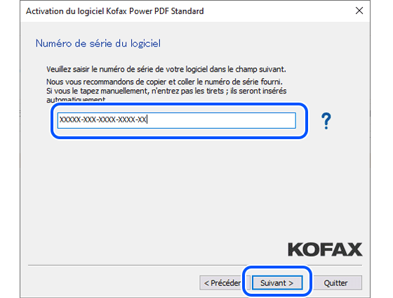 - Saisissez le numéro de série, et cliquez ensuite sur [Suivant].