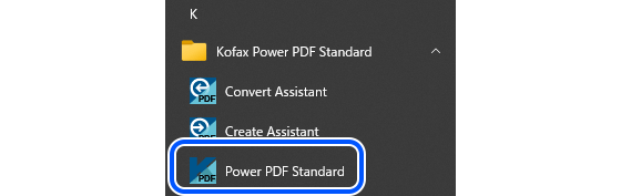 - Windowsのスタートメニューで [Kofax Power PDF Standard] > [Power PDF Standard]の順に選択します。