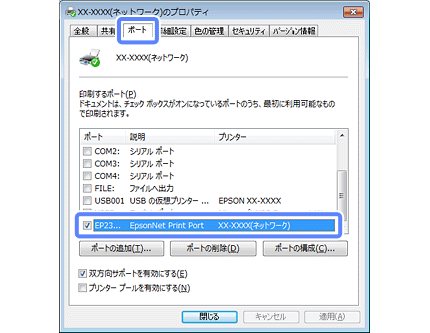 [ポート]タブをクリックして、リストに表示されたご使用プリンターのポートが[EpsonNet Print Port]になっていることを確認します。
