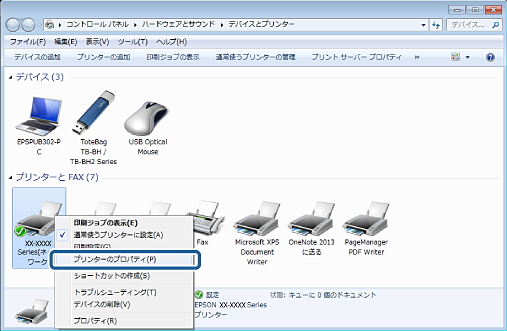 2対象プリンターのアイコンを右クリックして、[プリンターのプロパティ]をクリックします。