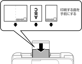 印刷する面を手前にして中央にセットし、用紙ガイドをハガキの側面に合わせてください。