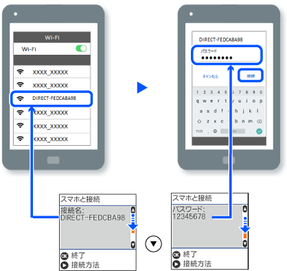 スマートデバイスのWi-Fi接続画面を表示し、プリンターの操作パネルに表示されたSSIDを選択して、パスワードを入力します。
