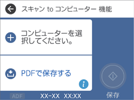プリンターがネットワークに接続されているときは、スキャンした画像を保存するコンピューターを選択できます。操作パネルには20台までのコンピューターが表示されます。Epson Event Managerで[ネットワークスキャン名(半角英数字)]を設定していると、ネットワークスキャン名が表示されます。