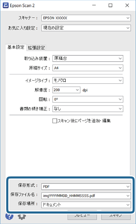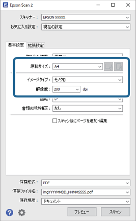 各設定項目の説明はEpson Scan 2のヘルプをご覧ください。