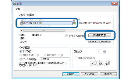 ご使用のプリンター名を選択して、[詳細設定]をクリックしてください。
