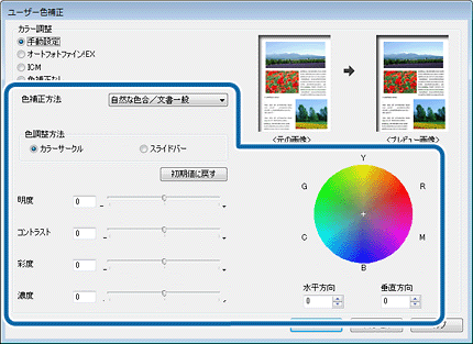 写真印刷など色補正をして印刷できます。色の補正方法(自動、ユーザー設定)を選択できます。