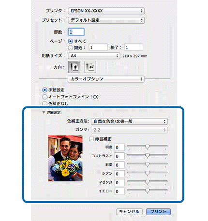 色調補正方法や明度、コントラスト、彩度などの色合いを手動で調整して印刷します。