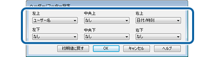 [ヘッダー/フッター設定]画面で、印刷する位置に記載する内容を選択します。