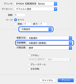 ポップアップメニューの[印刷設定]を選択し、[用紙種類]から印刷する用紙を選択します。