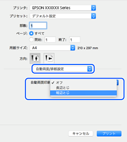 両面印刷が必要な場合は、ポップアップメニューの[自動両面/排紙設定]を選択して、[自動両面印刷]からとじ方を選択します。