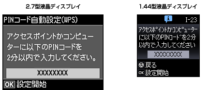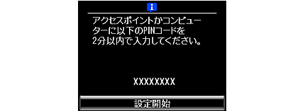 画面に表示されたPINコードをアクセスポイントかパソコンに入力します。プリンターの操作パネルでも[設定開始]を押します。