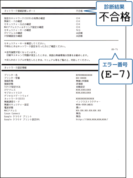 アクセスポイントのマニュアルを参照して、MACアドレスフィルタリング機能を確認してください。フィルタリング機能が「有効」のときは、プリンターのMACアドレスを登録し、プリンターがフィルタリングされないように設定してください。プリンターのMACアドレスは、印刷した「ネットワーク設定情報/接続診断レポート」の「ネットワーク設定情報」-「MACアドレス」に表示されています。