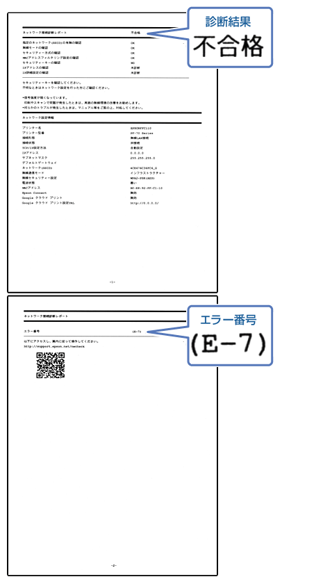 ネットワーク(SSID)を直接入力したときは、入力したネットワーク(SSID)が正しいかを確認して、再度入力してください。「ネットワーク(SSID)」は、印刷した「ネットワーク設定情報/接続診断レポート」の「ネットワーク設定情報」-「ネットワーク(SSID)」に表示されています。