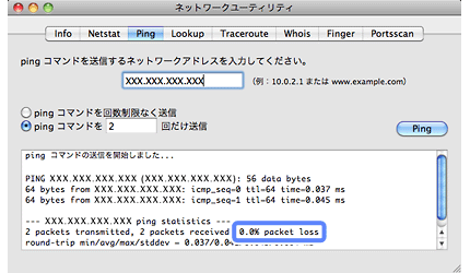 下図のように[0% packet loss]と表示されれば、パソコンとネットワーク機器は通信できています。
