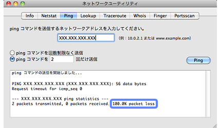 [Ping]タブをクリックし、手順1で確認したネットワーク機器のIPアドレスを入力して、[Ping]をクリックします。
