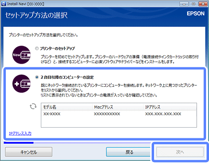 以下の画面では[2台目以降のコンピューターの設定]を選択し、リストから接続したいネットワークプリンターを選択し、[次へ]をクリックします。