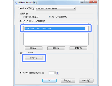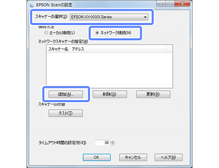 スキャナーがネットワーク接続できていないときは、「EPSON Scanの設定」を起動して、スキャナーの接続設定をご確認ください。