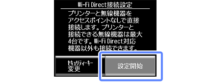 「無線機器をアクセスポイントなしで4台まで直接接続できます。」というメッセージを確認し、[設定開始]を選択して【OK】を押します。