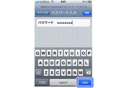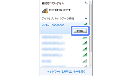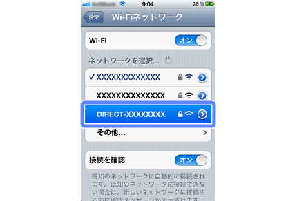 Wi-Fi接続画面から手順5でメモした「DIRECT-XXXXXXXX」を選択してください。
