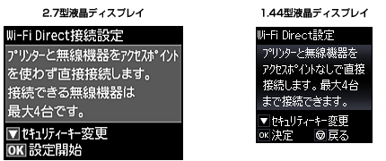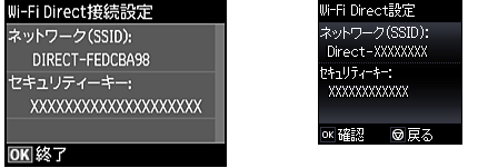 シンプルAPモードのセキュリティーキーを変更すると、プリンターに接続中の機器のWi-Fi接続が切断されます。[セキュリティーキー変更]を押して、設定したいセキュリティーキーを8〜22文字以内の半角英数字・記号(A〜Z、a〜z、0〜9:;<=>?@ (スペース)! #$%&'()*+,-./[¥]^_{│}~)で入力してください。Wi-Fi Direct 接続設定の画面に戻ります。