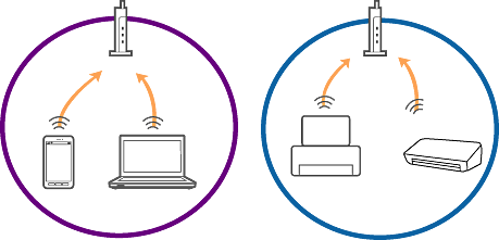 複数のアクセスポイントを使用している場合、アクセスポイント間の設定によってはコンピューターやスマートデバイスからプリンターを利用できません。コンピューターやスマートデバイスをプリンターと同じアクセスポイントに接続してください。