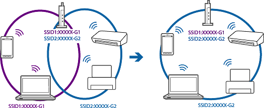 1台で複数のSSIDを使用できるアクセスポイントの場合、同じアクセスポイントに接続していても、SSIDが異なると接続できません。コンピューターやスマートデバイスをプリンターと同じSSIDに接続してください。