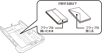 • のり付けおよび接着の処理が施された封筒や二重封筒、窓付き封筒、フラップ(封を閉じる折り返しの部分)が円弧や三角形状の長形封筒や角形封筒は使用しないでください。紙詰まりや印刷汚れの原因になります。