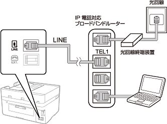 IP電話対応のブロードバンドルーターとプリンター背面部のLINEポートをモジュラーケーブルで接続します。詳しくはご契約の回線事業者に問い合わせてください 。