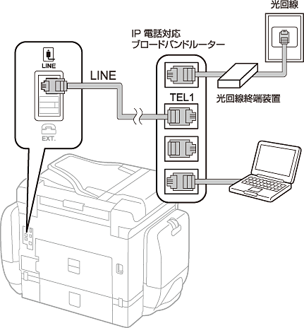 IP電話対応のブロードバンドルーターとプリンター背面部のLINEポートをモジュラーケーブルで接続します。詳しくはご契約の回線事業者に問い合わせてください 。