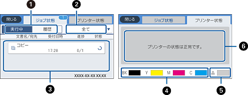 ボタンを押して[ジョブ/状態]メニューを表示します。プリンターの状態やジョブの確認ができます。