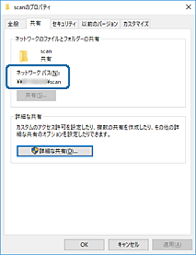 [共有]タブを選択します。共有フォルダーのネットワークパスが表示されます。プリンターのアドレス帳の登録で使用するので、メモしておくか、コピーしておいてください。