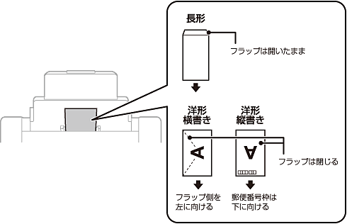 • フラップを一度折った長形封筒や折り跡のある封筒、反った封筒は使用しないでください。紙詰まりや印刷汚れの原因になります。