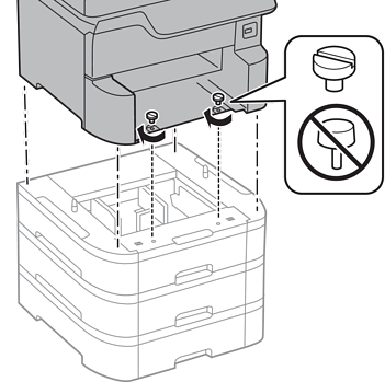 プリンターを、増設カセットユニットの四隅と合わせながらゆっくり下ろして置き、ネジで固定します。