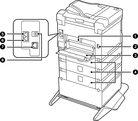 メンテナンスボックスや給紙ローラーの交換、内部に詰まった用紙を取り除くときに開けます。