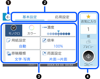 設定項目の一覧をタブで切り替えます。[基本設定]タブでは、よく使われる設定項目が表示されます。[応用設定]タブには、必要に応じて設定する項目が表示されます。 |