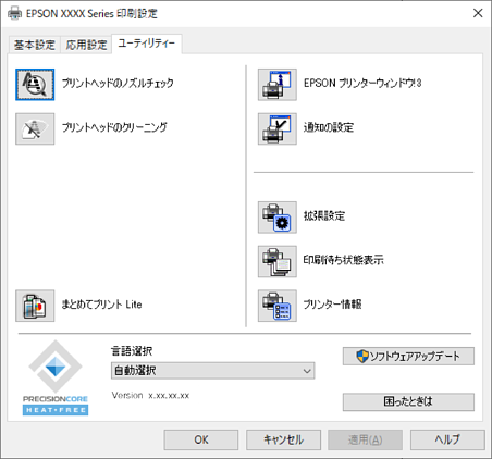 プリンタードライバーの言語を変更します。画面を開き直すと言語が変更されます。