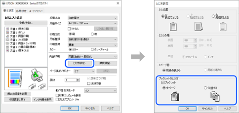 [とじ方設定]をクリックし、[ブックレット]にチェックして[全ページ] または[分割する]を選択します。
