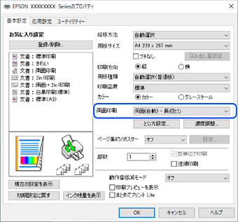 [両面印刷]から[両面(自動) - 長辺とじ]を選択します。