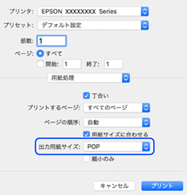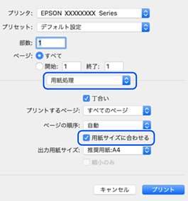ポップアップメニューの[用紙処理]を選択し、[用紙サイズに合わせる]にチェックします。