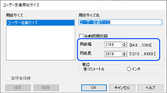 印刷したい用紙の用紙幅、用紙長を入力して、[OK]をクリックします。