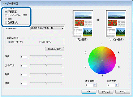 写真印刷など色補正をして印刷できます。色の補正方法(自動、ユーザー設定)を選択できます。