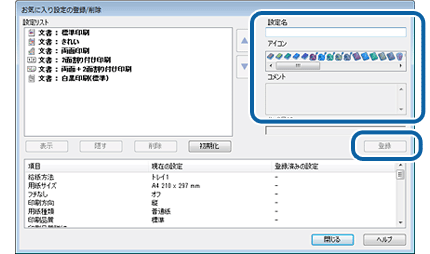 [設定名]/[コメント]を入力して[アイコン]を選択して[登録]をクリックします。