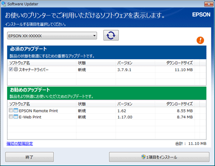 EPSON Software Updater(エプソン ソフトウェア アップデーター)は、インターネットに接続して、新しいソフトウェアや更新情報があるか確認してインストールするソフトウェアです。更新方法は以下をご覧ください。