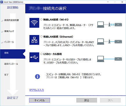 インストーラーの画面の指示に従って操作して、以下の画面が表示されたらコンピューターとプリンターの接続方法を選択します。