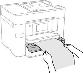 長尺紙は、用紙カセットを手前に引き伸ばし、用紙を手で支えてセットしてください。 給紙が始まったら手を放してください。
