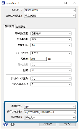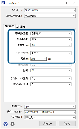 各設定項目の説明はEpson Scan 2のヘルプをご覧ください。