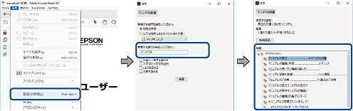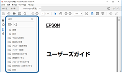 PDFマニュアルでは、探したい情報のキーワードから該当箇所を検索したり、しおりから直接ジャンプしたりすることができます。また、必要なページだけ印刷することもできます。ここでは、PDFマニュアルをコンピューターのAdobe Reader Xで開いた場合の使い方を説明します。