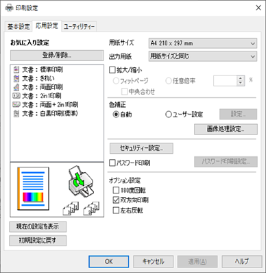 出力する用紙サイズを選択します。[用紙サイズ]と[出力用紙]のサイズが異なるときは、[拡大/縮小]が自動で選択されます。拡大、縮小印刷をしないときは、選択する必要はありません。