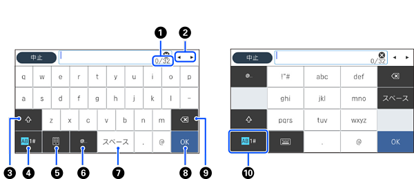 文字種を切り替えます。 AB: アルファベット 1#: 数字と記号 |