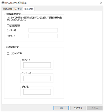 管理者によってプリンターの使用が制限されている場合は、プリンタードライバーに許可されているユーザー名とパスワードを登録すると印刷できます。ログオン情報はプリンターの管理者に確認してください。